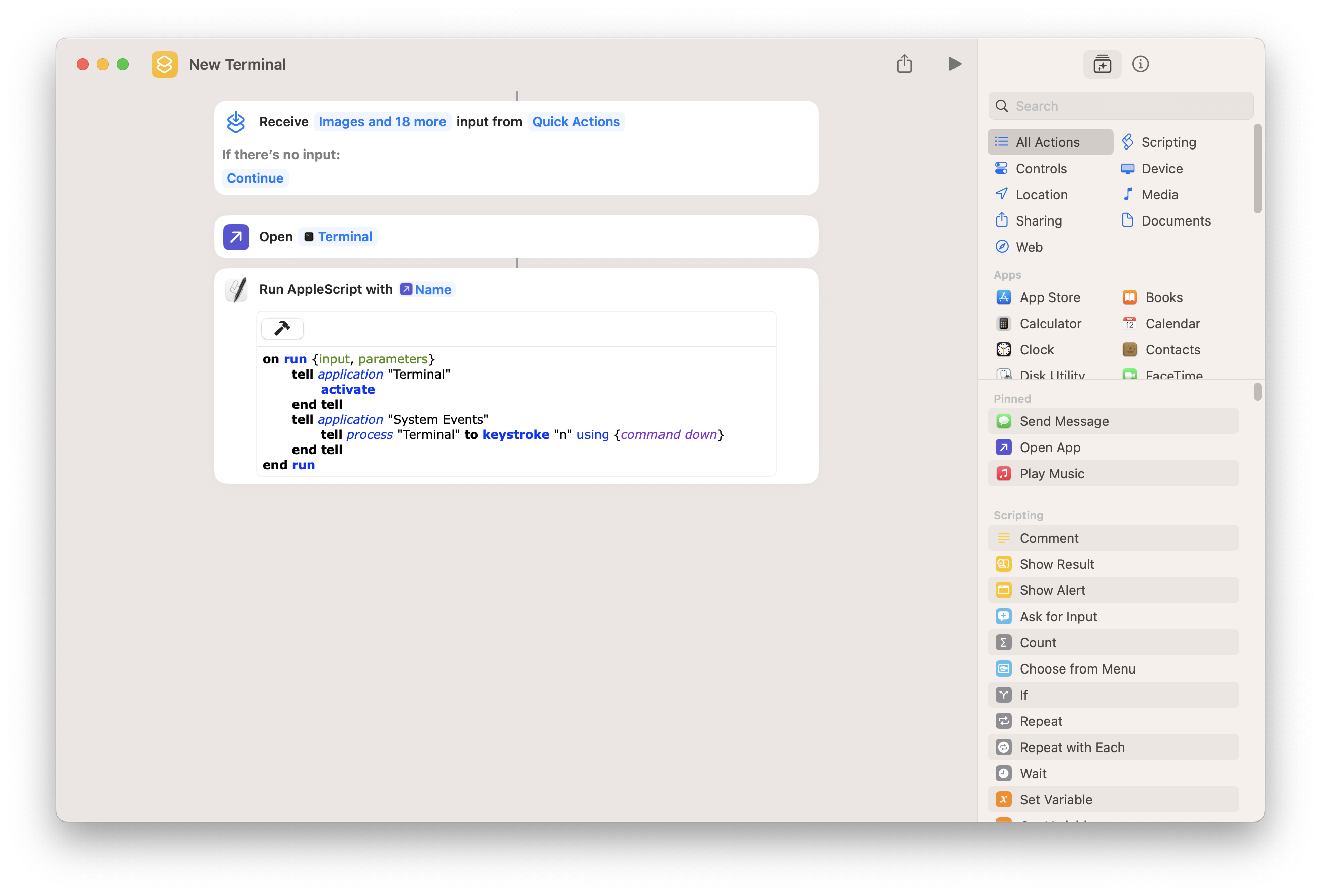 On Linux, you press Alt-F3 and you get a new shell. There is no equivalent on Mac, but I've got the next-best thing, which is a menu bar shortcut and keyboard shortcut to open Terminal and get a new window. Put the following in your Shortcuts app: